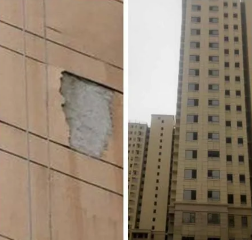 仿石漆外墻形成空鼓及裂縫,底層的空鼓以致將面層拉裂。