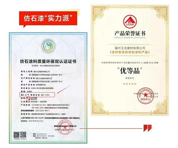 憑借強大的產(chǎn)品實力,金師傅御石漆先后斬獲仿石涂料行業(yè)國家“仿石涂料質(zhì)量與環(huán)保雙認證”證書并榮膺“優(yōu)等品”等多項榮譽稱號。這些都將成為支撐銷售的有力武器,助力加盟伙伴更好地開拓市場、成交業(yè)績。